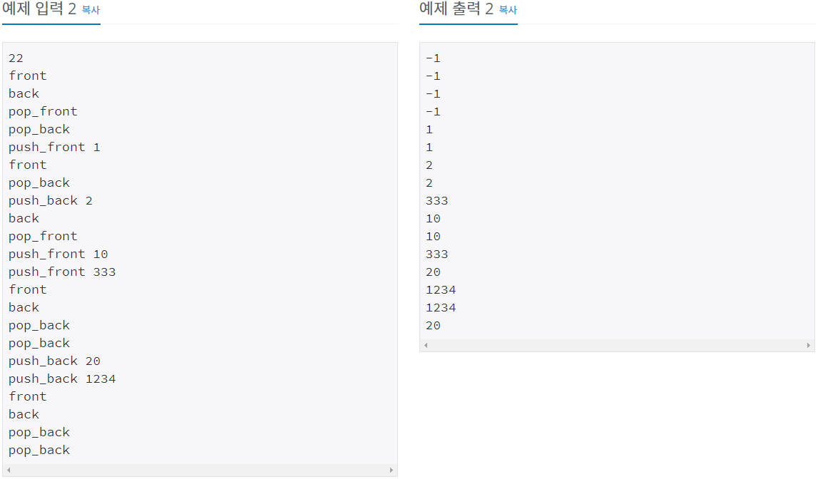 정수를 저장하는 덱(Deque)를 구현한 다음, 입력으로 주어지는 명령을 처리하는 프로그램을 작성하시오.