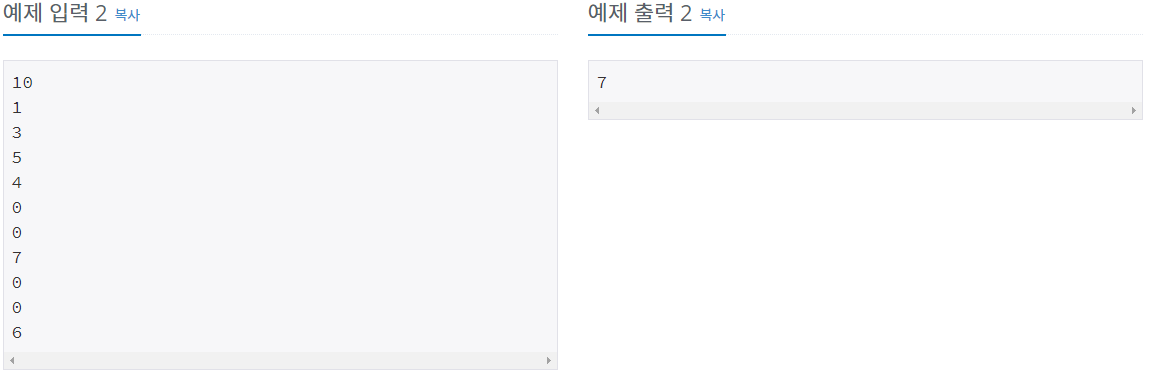 이후 K개의 줄에 정수가 1개씩 주어진다. 정수는 0에서 1,000,000 사이의 값을 가지며, 정수가 "0" 일 경우에는 가장 최근에 쓴 수를 지우고, 아닐 경우 해당 수를 쓴다.