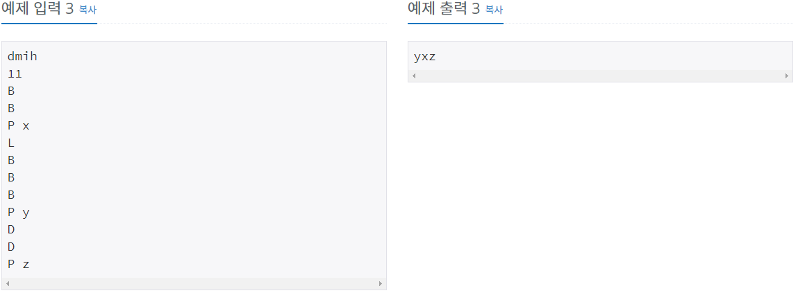 초기에 편집기에 입력되어 있는 문자열이 주어지고, 그 이후 입력한 명령어가 차례로 주어졌을 때, 모든 명령어를 수행하고 난 후 편집기에 입력되어 있는 문자열을 구하는 프로그램을 작성하시오. 단, 명령어가 수행되기 전에 커서는 문장의 맨 뒤에 위치하고 있다고 한다.