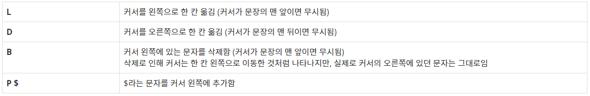 이 편집기에는 '커서'라는 것이 있는데, 커서는 문장의 맨 앞(첫 번째 문자의 왼쪽), 문장의 맨 뒤(마지막 문자의 오른쪽), 또는 문장 중간 임의의 곳(모든 연속된 두 문자 사이)에 위치할 수 있다. 즉 길이가 L인 문자열이 현재 편집기에 입력되어 있으면, 커서가 위치할 수 있는 곳은 L+1가지 경우가 있다.