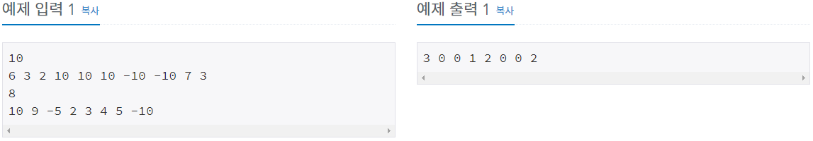 숫자 카드는 정수 하나가 적혀져 있는 카드이다. 상근이는 숫자 카드 N개를 가지고 있다. 정수 M개가 주어졌을 때, 이 수가 적혀있는 숫자 카드를 상근이가 몇 개 가지고 있는지 구하는 프로그램을 작성하시오.