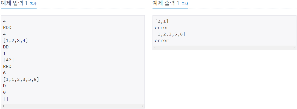 함수 R은 배열에 있는 숫자의 순서를 뒤집는 함수이고, D는 첫 번째 숫자를 버리는 함수이다. 배열이 비어있는데 D를 사용한 경우에는 에러가 발생한다.