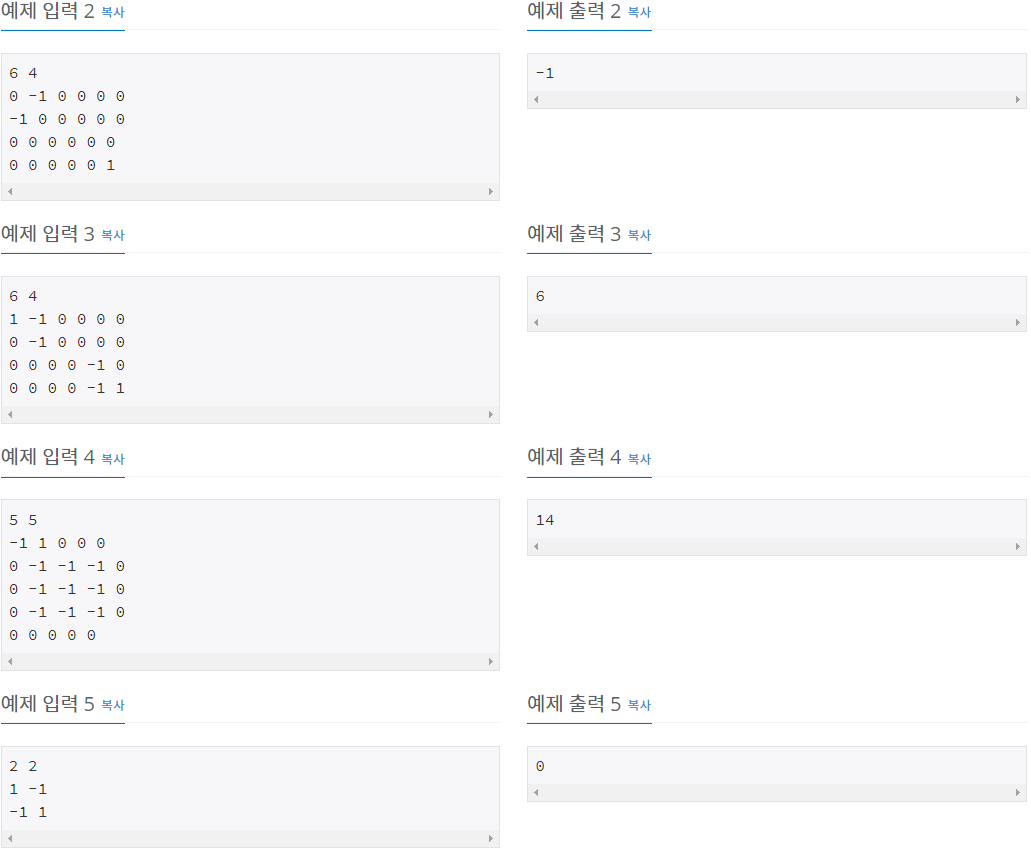 여러분은 토마토가 모두 익을 때까지의 최소 날짜를 출력해야 한다. 만약, 저장될 때부터 모든 토마토가 익어있는 상태이면 0을 출력해야 하고, 토마토가 모두 익지는 못하는 상황이면 -1을 출력해야 한다.