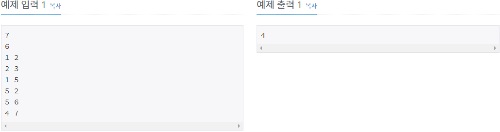 첫째 줄에는 컴퓨터의 수가 주어진다. 컴퓨터의 수는 100 이하이고 각 컴퓨터에는 1번 부터 차례대로 번호가 매겨진다. 둘째 줄에는 네트워크 상에서 직접 연결되어 있는 컴퓨터 쌍의 수가 주어진다. 이어서 그 수만큼 한 줄에 한 쌍씩 네트워크 상에서 직접 연결되어 있는 컴퓨터의 번호 쌍이 주어진다.