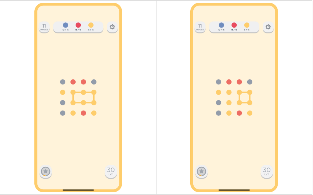 각각의 칸은 색이 칠해진 공이 하나씩 있다. 이 게임의 핵심은 같은 색으로 이루어진 사이클을 찾는 것이다.