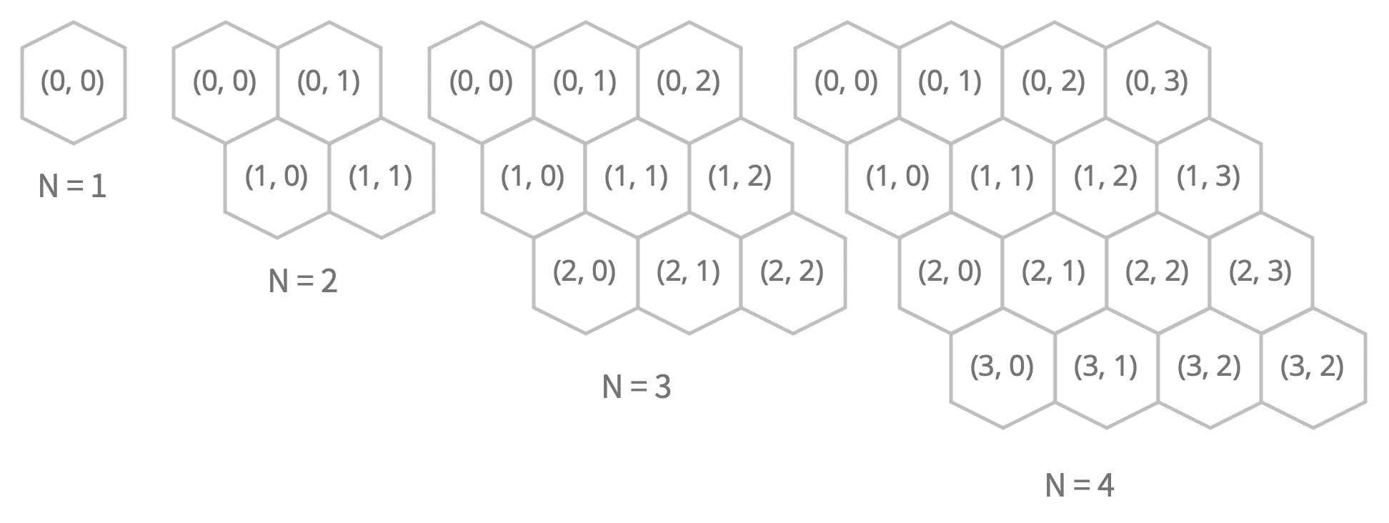 크기가 N × N인 육각 보드가 주어진다. 아래 그림은 N = 1, 2, 3, 4인 경우의 그림이다.