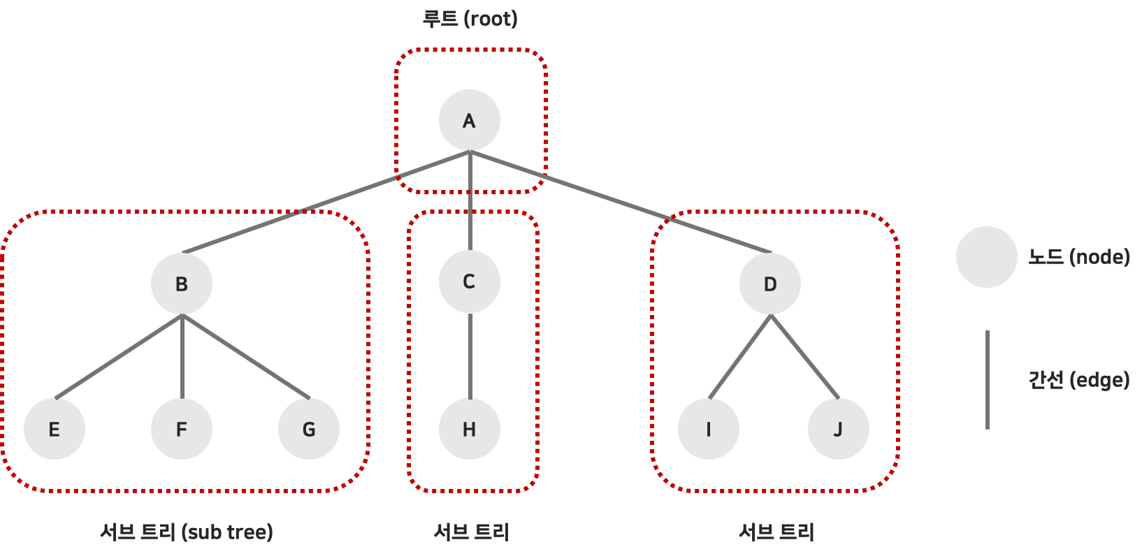 전체 트리구조에서 A가 루트노드(Root Node)이고 그 밑에 존재한 나머지 {B,C,D,E,F,G,H,I,J}들은 서브 트리이다.